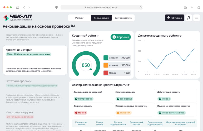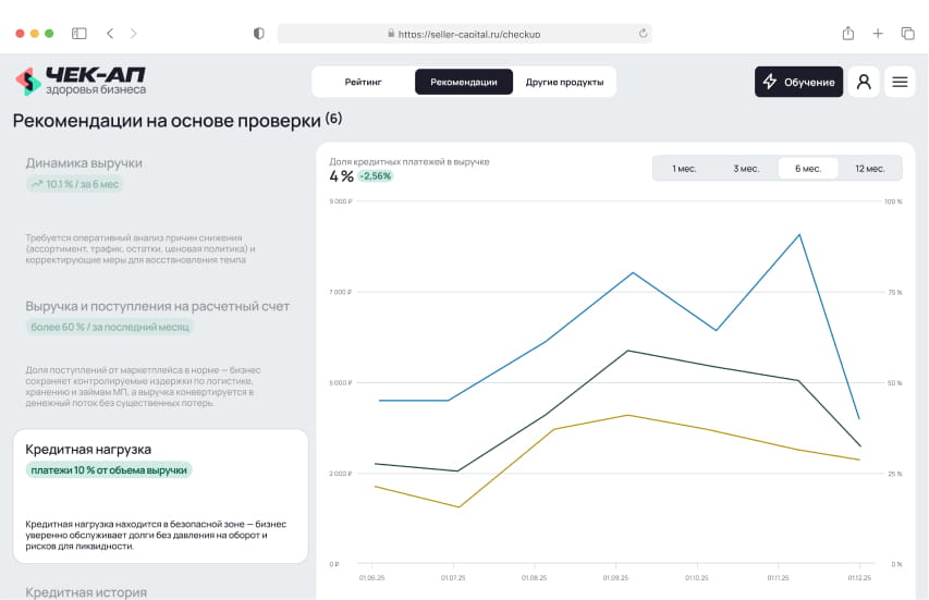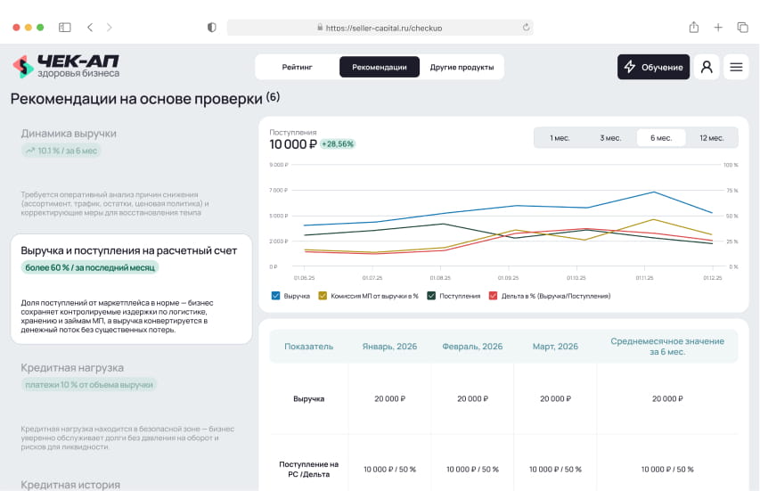 Чек-ап здоровья бизнеса от Seller Capital — финансово-управленческая диагностика за 15 минут, которая показывает реальное состояние бизнеса на маркетплейсах Результат чек-апа — персональный аналитический отчёт с ключевыми финансовыми метриками, динамикой показателей и рекомендациями по росту и стабилизации